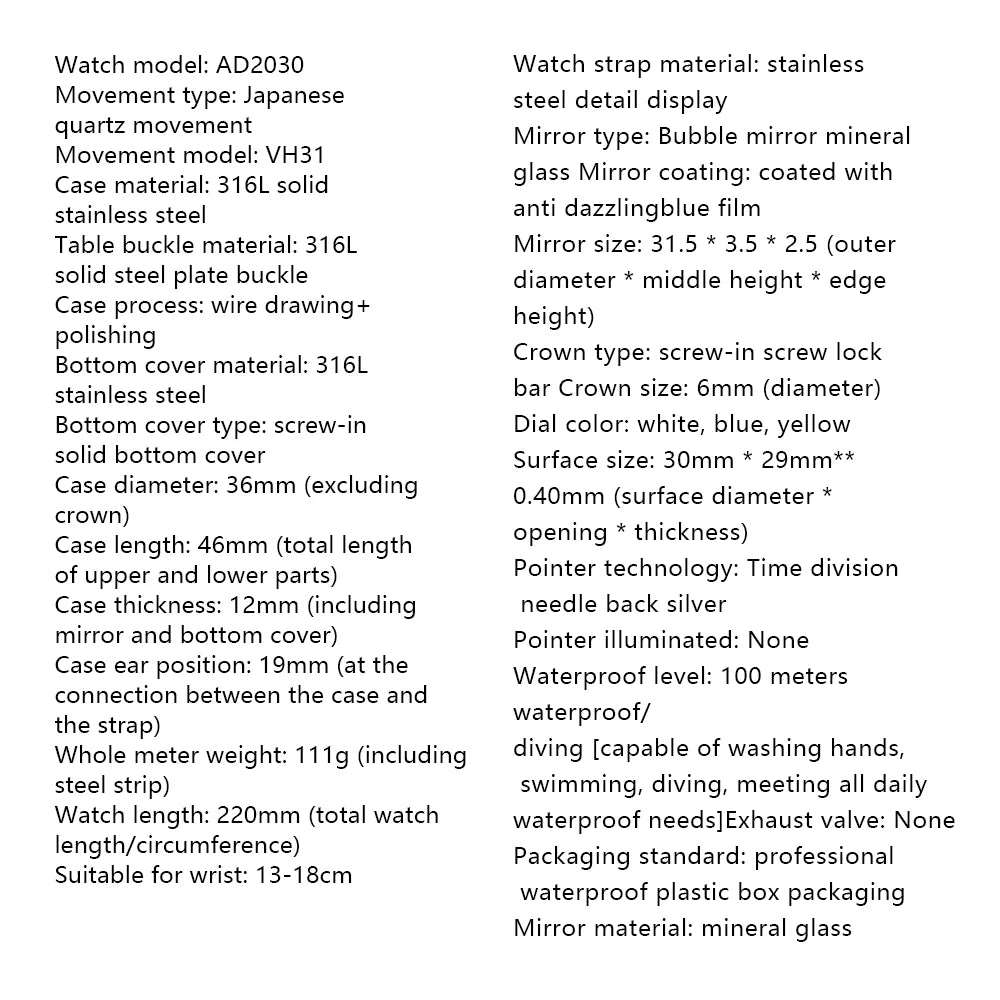 The ADDIESDIVE AD2030D 36mm Quartz Watch combines compact proportions with a rugged yet refined character. Its sand-textured desert dial, 316L stainless steel case, and domed K1 mineral crystal with anti-dazzle blue coating deliver a vintage-inspired look with modern durability. Powered by a Japanese VH31 quartz movement, it features a smooth sweeping seconds hand, luminous hands, and 100M water resistance—ideal for daily wear, outdoor use, or travel. A solid stainless-steel bracelet with folding clasp provides a secure and comfortable fit.