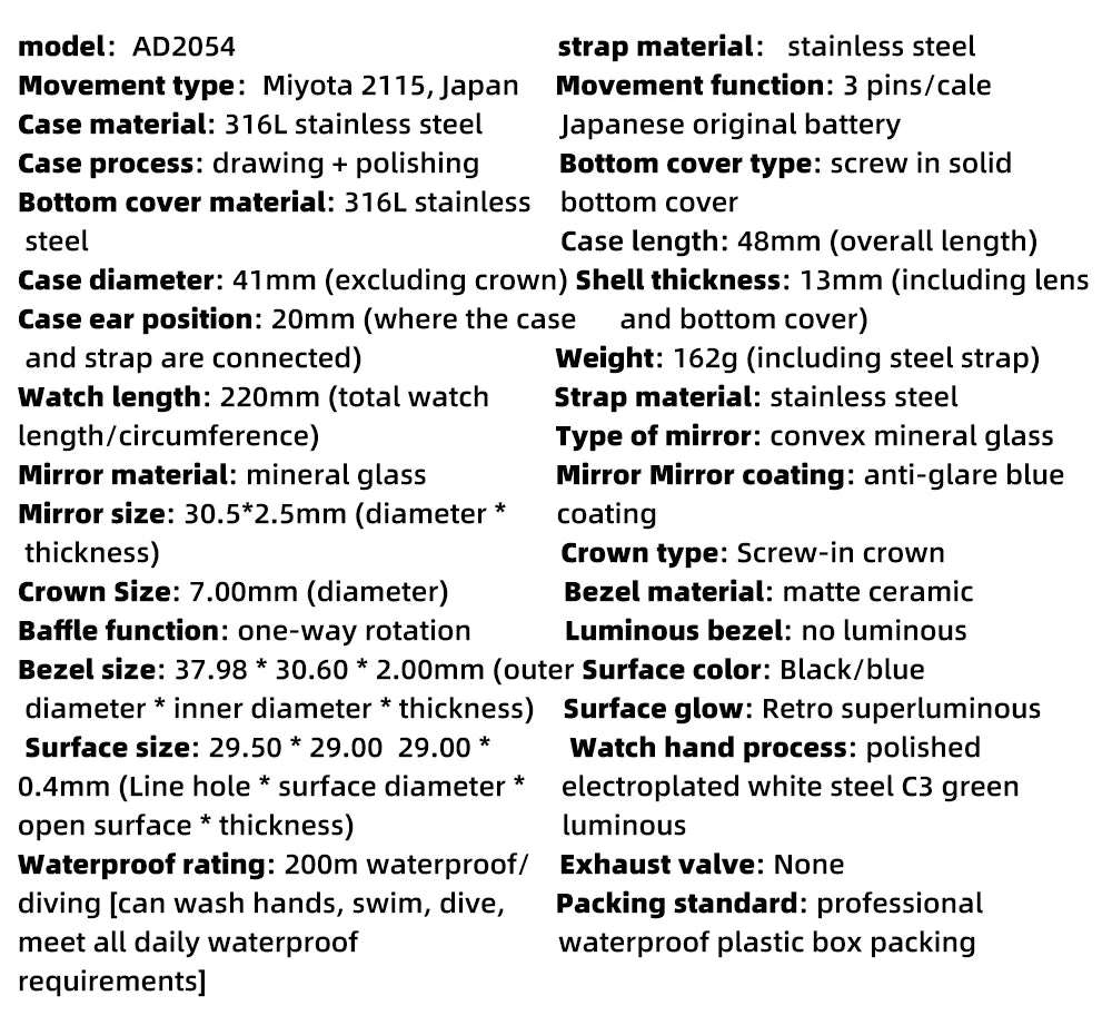 Rated for 200 meters of water resistance with a screw-down crown and caseback, the AD2054 is engineered for both everyday use and underwater performance. Vintage-style C3 lume and a clean dial layout provide excellent low-light visibility, while the stainless-steel bracelet ensures a secure and comfortable fit.