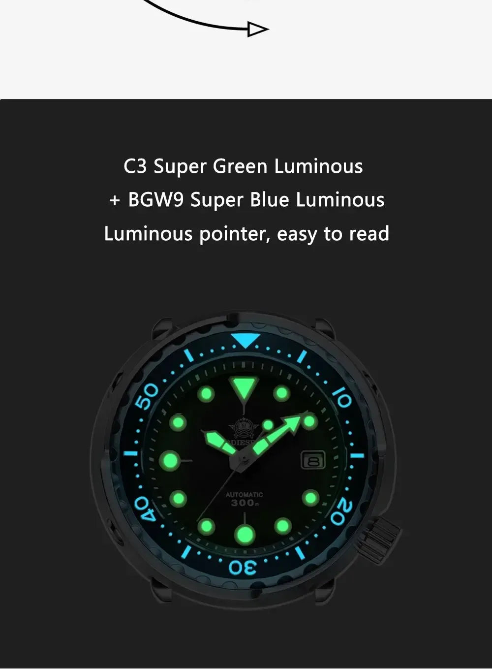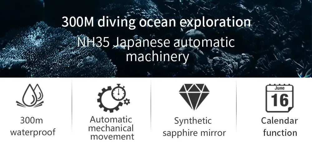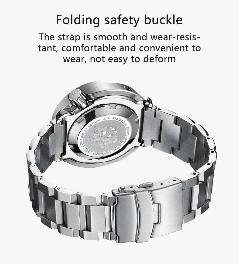The ADDIESDIVE MY-H5 Tuna Automatic Diver is built for extreme underwater reliability, combining a rugged tuna-style case with professional 300M water resistance. Powered by the dependable Seiko NH35 automatic movement, it delivers smooth mechanical performance with a 41-hour reserve, stop-second function, and proven durability. A ceramic 120-click bezel, double-layer sapphire crystal with anti-glare coating, and Swiss C3 Super-LumiNova ensure clarity and visibility in any environment. The watch includes both a stainless steel bracelet and a silicone strap, offering versatility for diving, travel, and everyday wear.