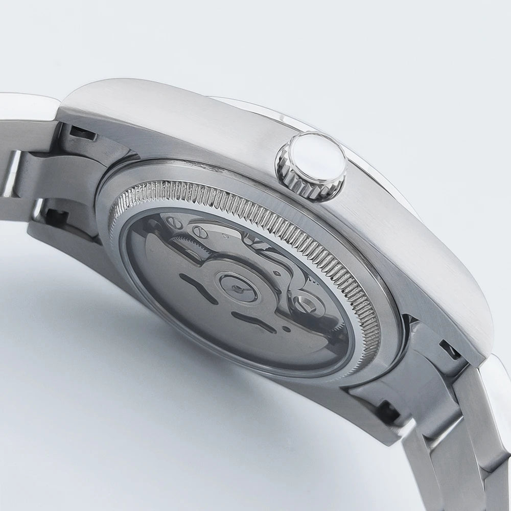 Powered by the Japan NH35 automatic movement, this model offers smooth hand-winding capability, hacking seconds, and consistent timekeeping. The 316L stainless steel case is complemented by a solid-link bracelet and a sapphire crystal for superior scratch resistance. Available with glass or solid caseback options.