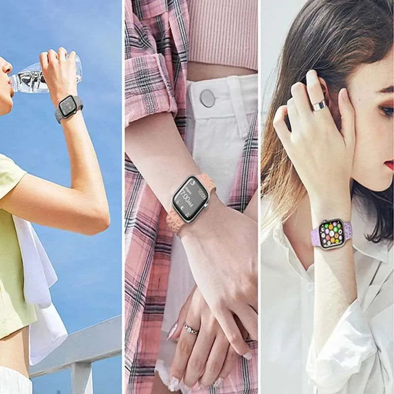 Crafted from soft, flexible silicone, the strap feels lightweight on the wrist and resists sweat and moisture—making it suitable for daily wear, light workouts, or casual styling. This is a third-party accessory designed to be compatible with Apple Watch models across multiple sizes.