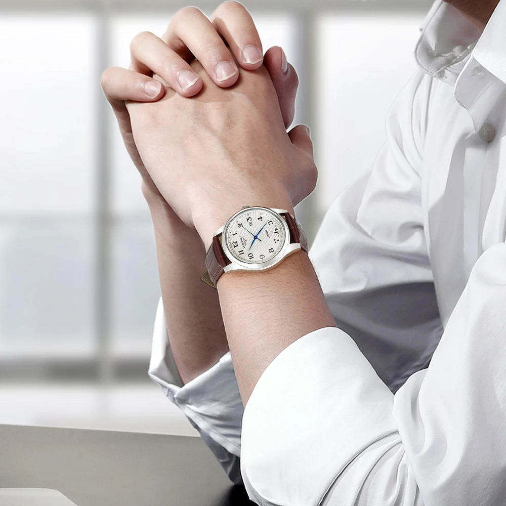 Crafted from selected leather with a smooth surface finish, the strap offers a comfortable feel on the wrist while maintaining a structured, elegant appearance. The underside lining is designed for daily wear comfort, making it suitable for both office use and formal occasions.
