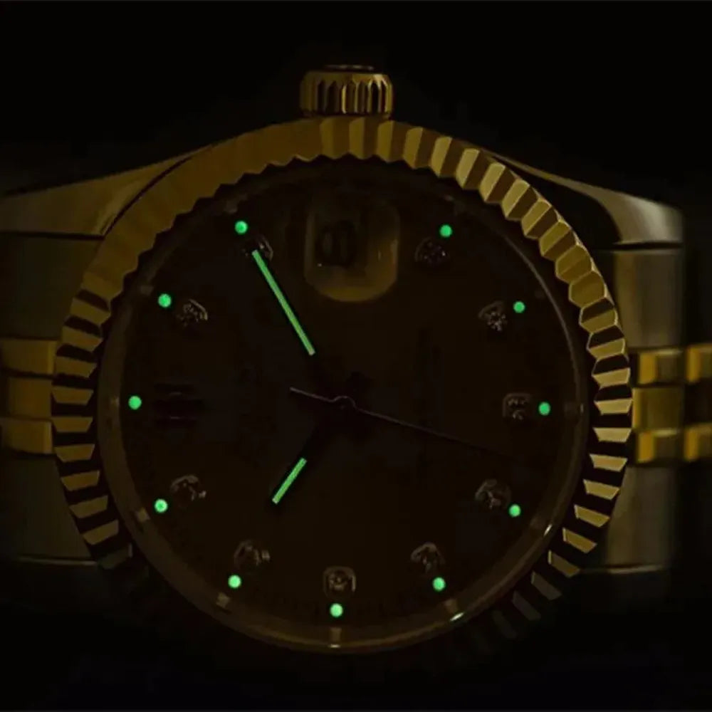 The Holuns 28mm Ladies Quartz Dress Watch pairs refined elegance with dependable everyday performance. Its polished stainless-steel case, fluted bezel, and jewel-accented hour markers create a timeless look suitable for both casual and formal wear. Powered by a precise Japanese quartz movement, it offers maintenance-free accuracy, while the date window with cyclops magnifier enhances daily practicality. A Hardlex mineral crystal provides scratch-resistant clarity, and the jubilee-style bracelet delivers a comfortable, graceful fit. With 5 ATM water resistance and a durable construction, this timepiece is designed for women who appreciate classic proportions and lasting reliability.