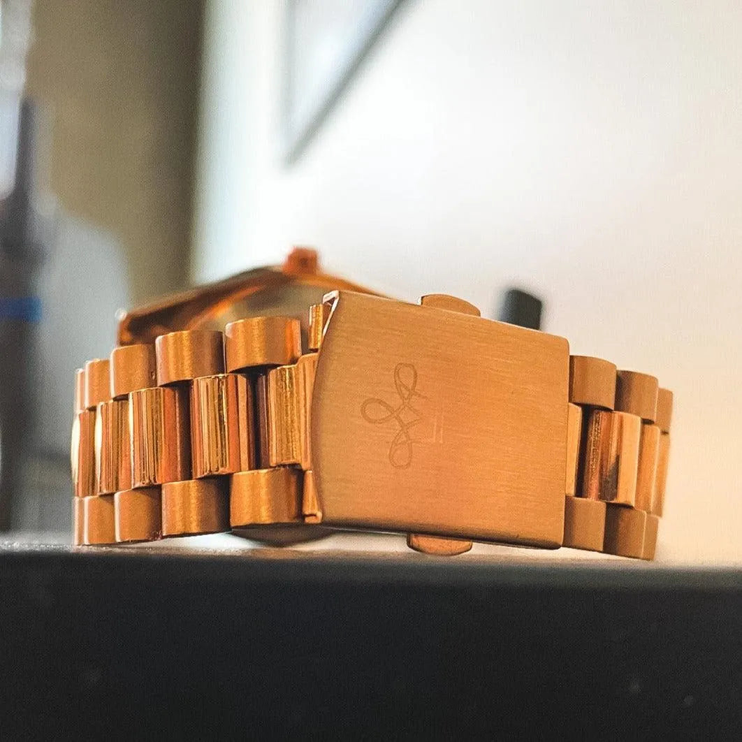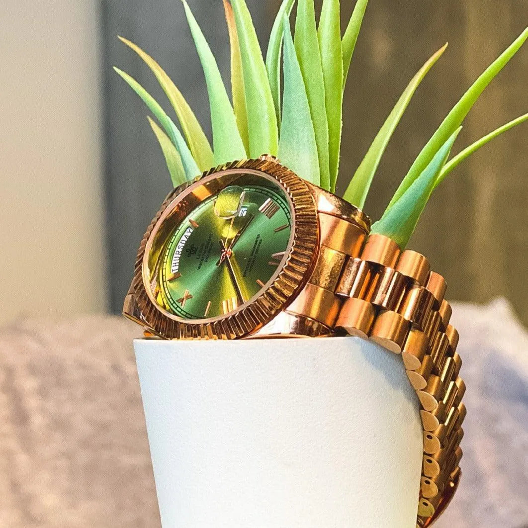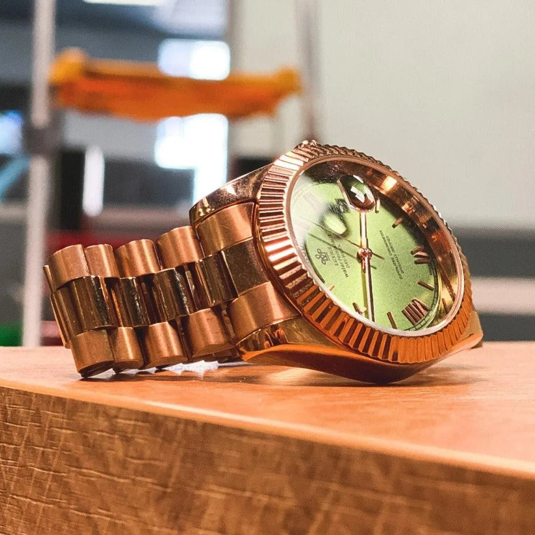 This 40mm quartz dress watch combines a polished stainless-steel finish with a refined rhinestone-marker dial, offering a clean and elegant look suitable for daily wear or formal occasions. The fluted bezel adds a textured highlight, while the Japan Miyota 2115 quartz movement ensures dependable accuracy with minimal maintenance. Built with a Hardlex mineral crystal, stainless-steel bracelet, luminous hands, and a practical day-date display, it delivers clarity and comfort for everyday use. A balanced, easy-to-wear dress watch that provides reliable performance with a subtle touch of shine.