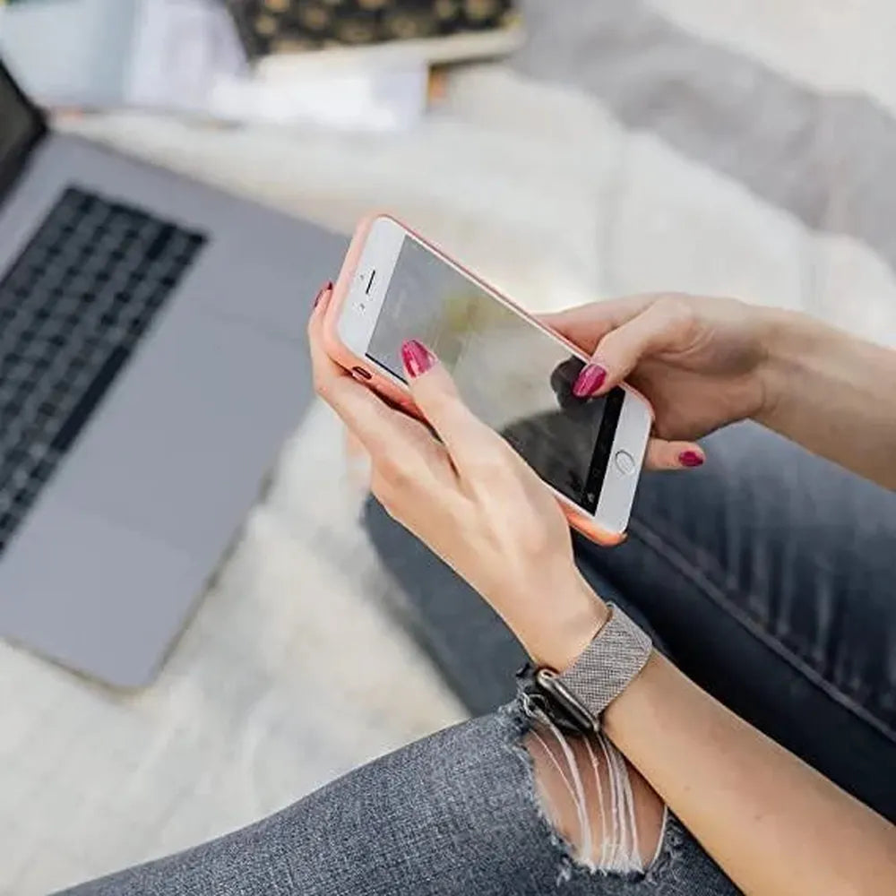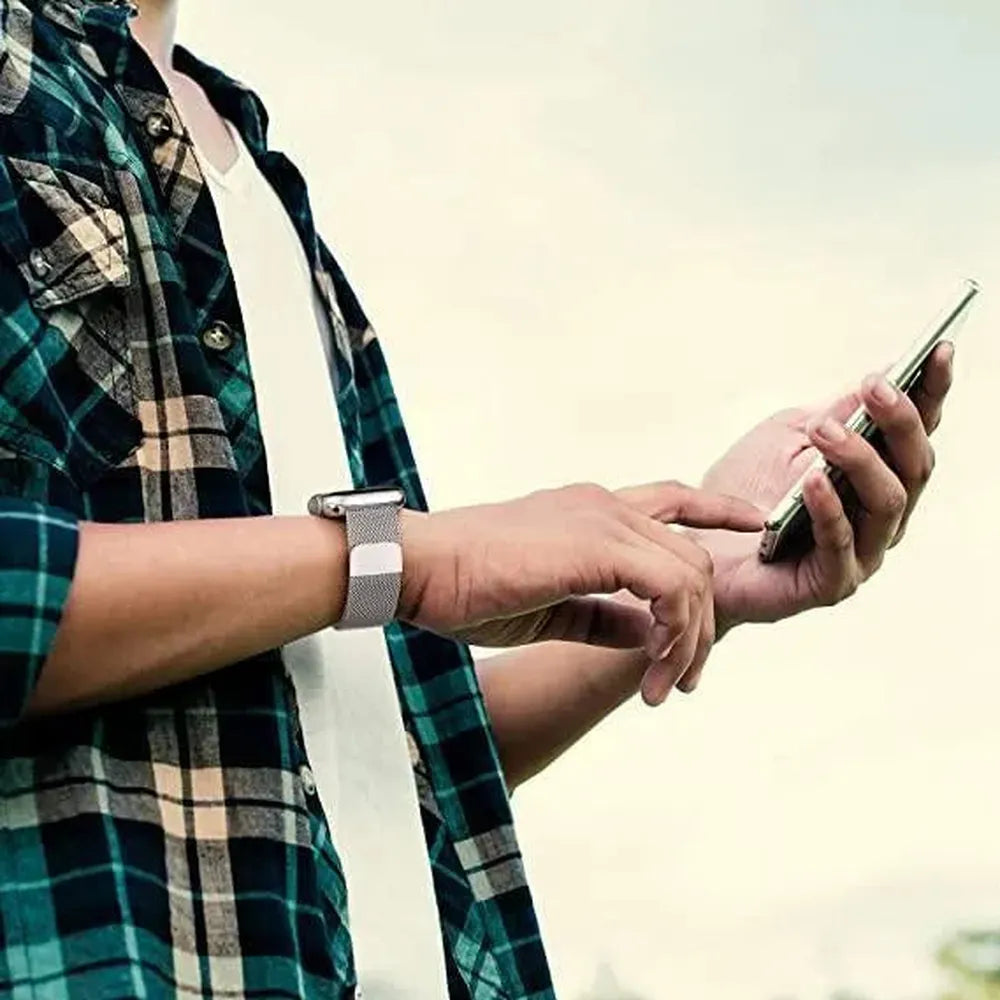 Upgrade your Apple Watch with this magnetic Milanese mesh loop strap, crafted from polished stainless steel for a slim, breathable, and comfortable fit. The flexible mesh design wraps smoothly around the wrist, while the strong magnetic closure allows precise adjustment without buckles or tools.