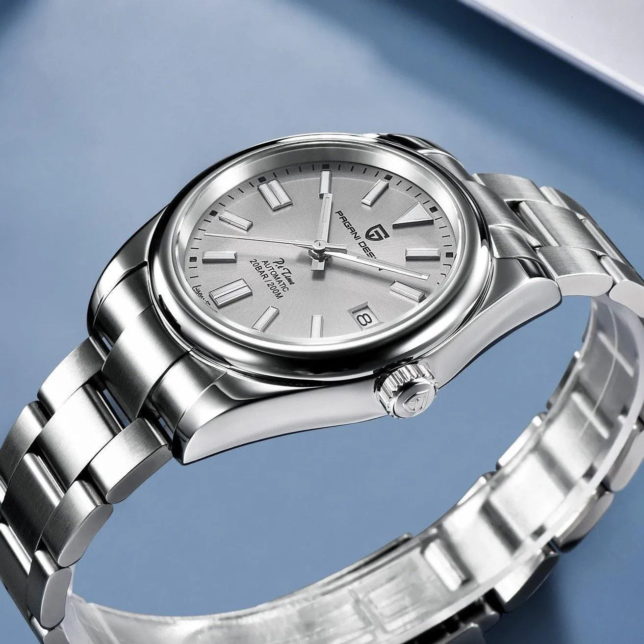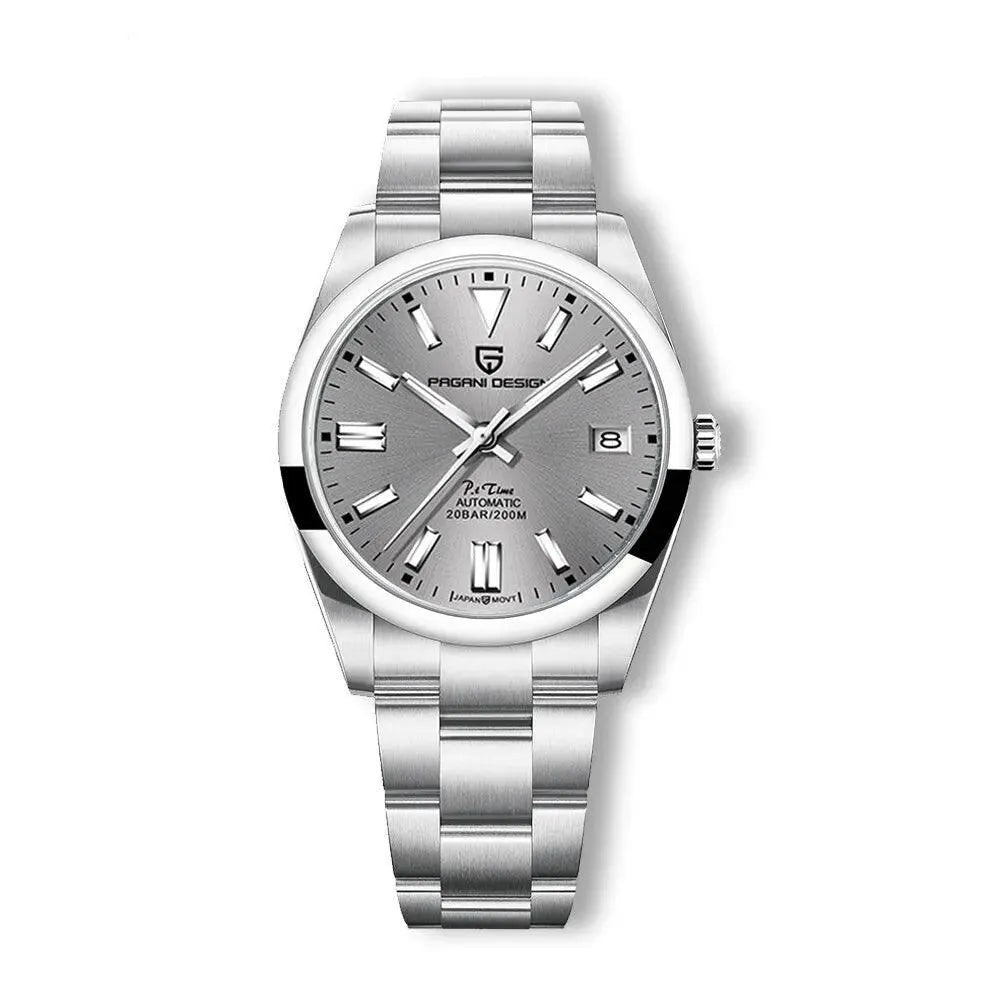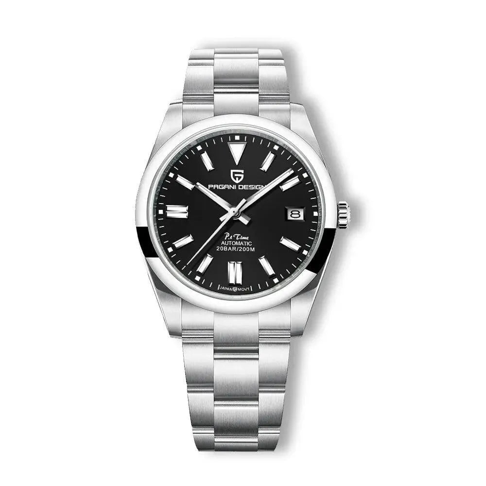This 39mm automatic stainless-steel watch from Pagani Design offers a refined, balanced silhouette built for everyday versatility and formal wear alike. Powered by the reliable Japan NH35 automatic movement, it delivers smooth self-winding performance with both manual-wind capability and dependable accuracy. The matte black 3D dial is paired with a sapphire crystal featuring anti-reflective coating for enhanced clarity, while luminous hands and markers provide visibility in low-light conditions. Crafted from solid 316L stainless steel with a brushed and polished finish, the watch is designed to withstand daily use and is rated for 200 meters of water resistance for confident swim-ready performance. A secure folding clasp with safety lock ensures comfortable wear throughout the day. Combining durability, precision, and a clean, modern dial layout, this 39mm automatic watch is a versatile choice for users seeking a timeless, high-quality timepiece.