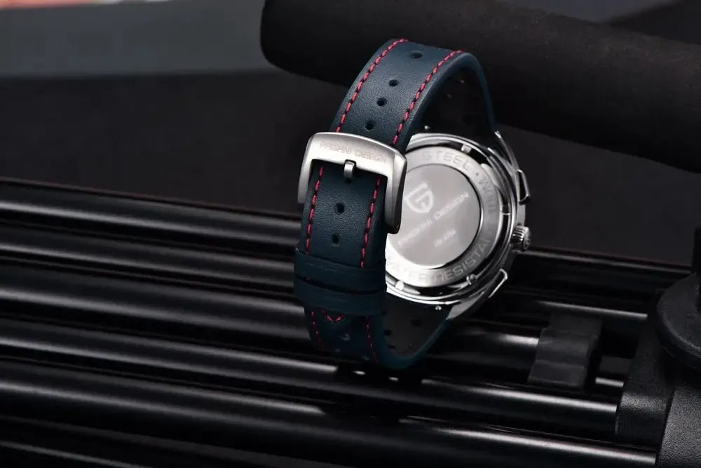 The Pagani Design 39mm Quartz Chronograph Sport Watch offers a compact retro-influenced design paired with dependable everyday functionality. Built with a polished 316L stainless steel case and domed synthetic sapphire crystal, it delivers both durability and vintage character. The Japanese VK63 quartz chronograph movement provides accurate stopwatch performance, supported by subdials and a tachymeter-style bezel for practical timing use. Luminous hands ensure low-light visibility, while the 10ATM water resistance and lightweight construction make it suitable for daily wear. Available with either a stainless steel bracelet or a genuine leather strap.