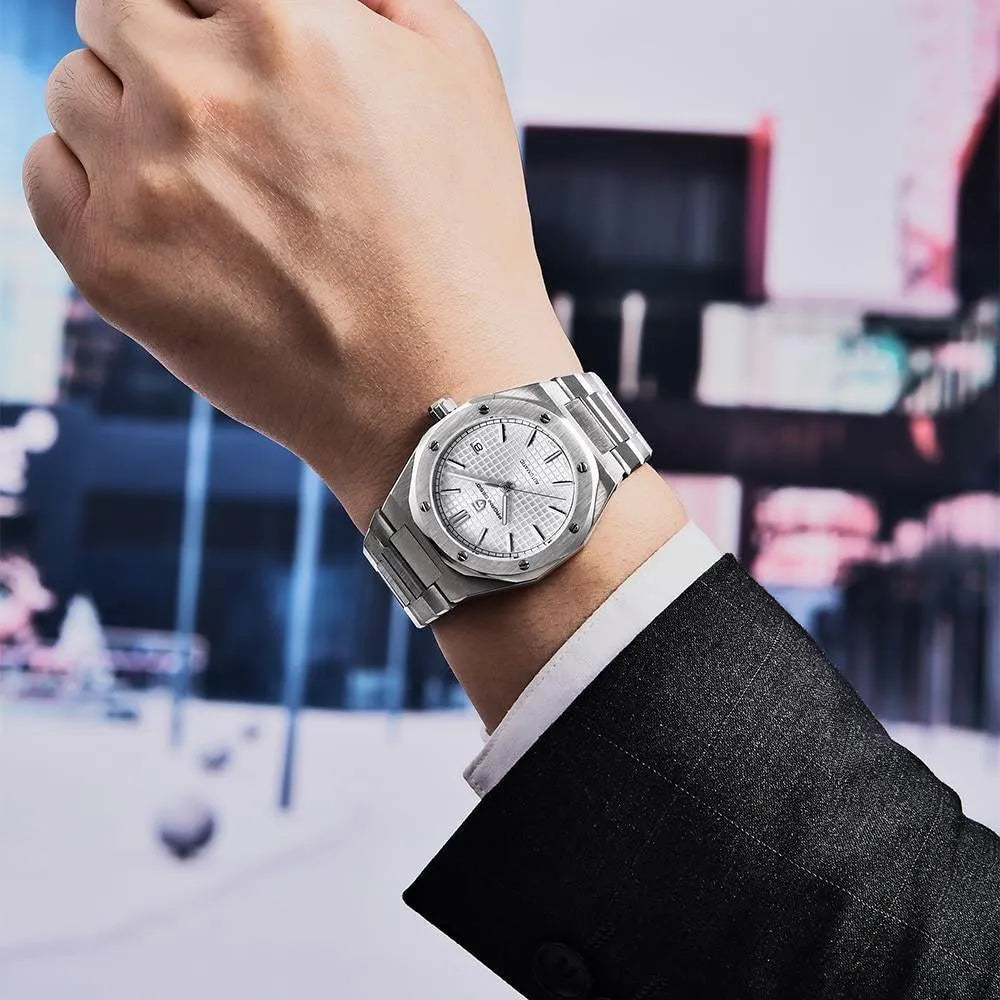 This 40mm automatic watch from Pagani Design features a bold rounded-octagonal case and integrated stainless-steel bracelet, delivering a clean, architectural appearance paired with reliable mechanical performance. Crafted from solid 316L stainless steel with brushed and polished finishing, it offers a refined presence suitable for both everyday wear and more formal settings. The Japan NH35 automatic movement provides smooth self-winding operation, while the sapphire crystal with anti-reflective coating ensures durable clarity. BGW9 luminous hands and markers enhance readability in low light, and the butterfly folding clasp offers a secure, seamless fit. Available in blue, black, or white waffle-textured dials, this integrated steel watch is built for users seeking modern design, durability, and dependable automatic performance.