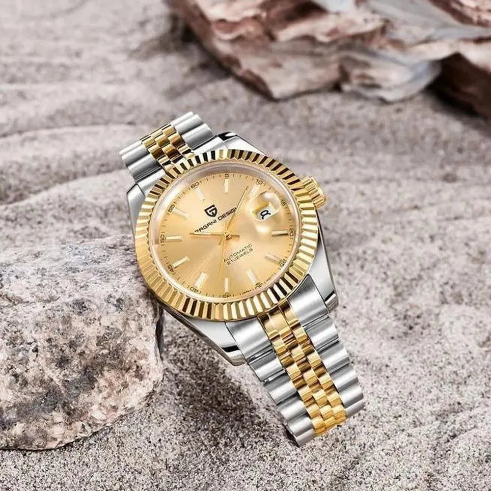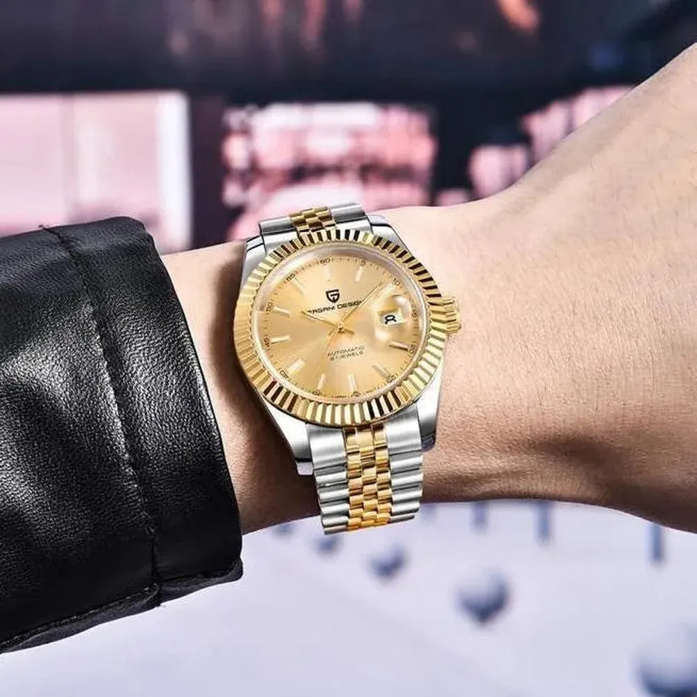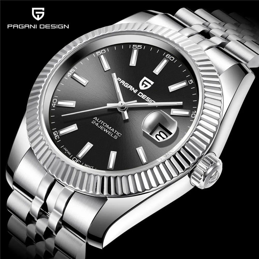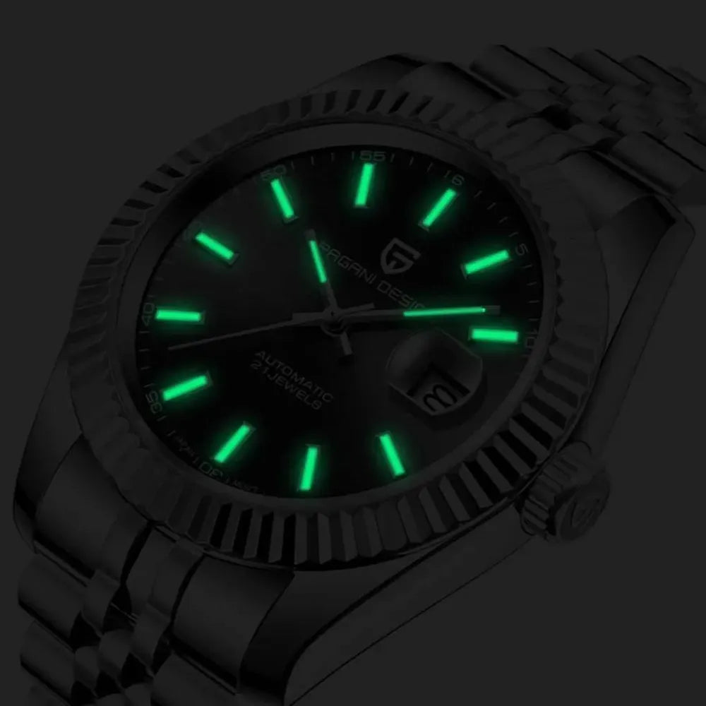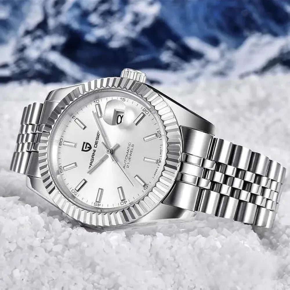 This 42mm automatic watch from Pagani Design offers a blend of classic aesthetics and durable everyday performance. Built with a brushed 316L stainless-steel case and a refined multi-link bracelet, it delivers a versatile look suitable for business, casual, or daily wear. The Japan NH35 automatic movement provides reliable self-winding performance with manual winding support, while the sapphire crystal with AR coating ensures long-lasting clarity and scratch resistance. A functional date display, luminous hands, and a secure folding clasp enhance practicality, and with 100M water resistance and a screw-down crown, the watch is ready for everyday conditions. Designed for comfort, durability, and modern style, this timepiece is an excellent choice for both new and experienced automatic watch owners.