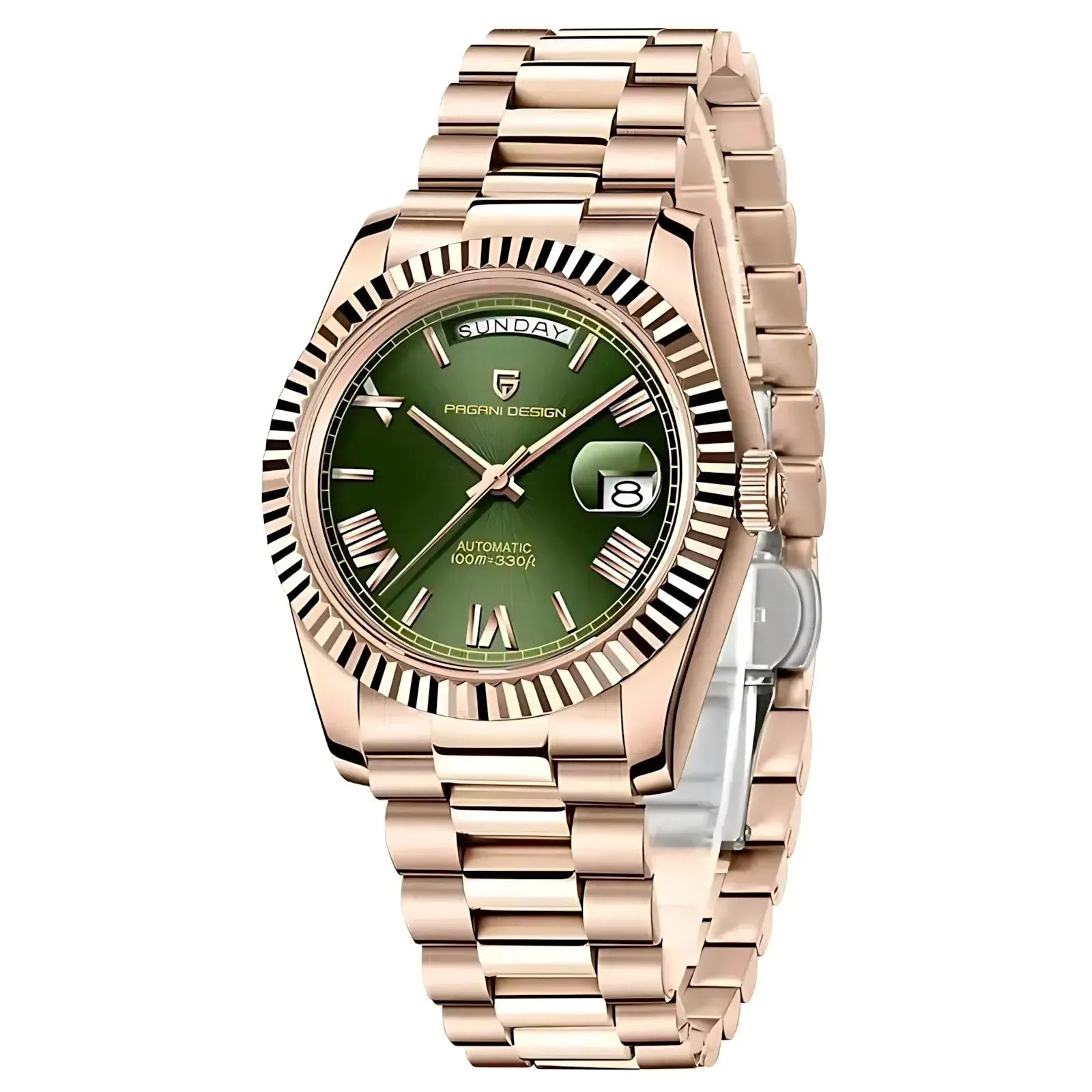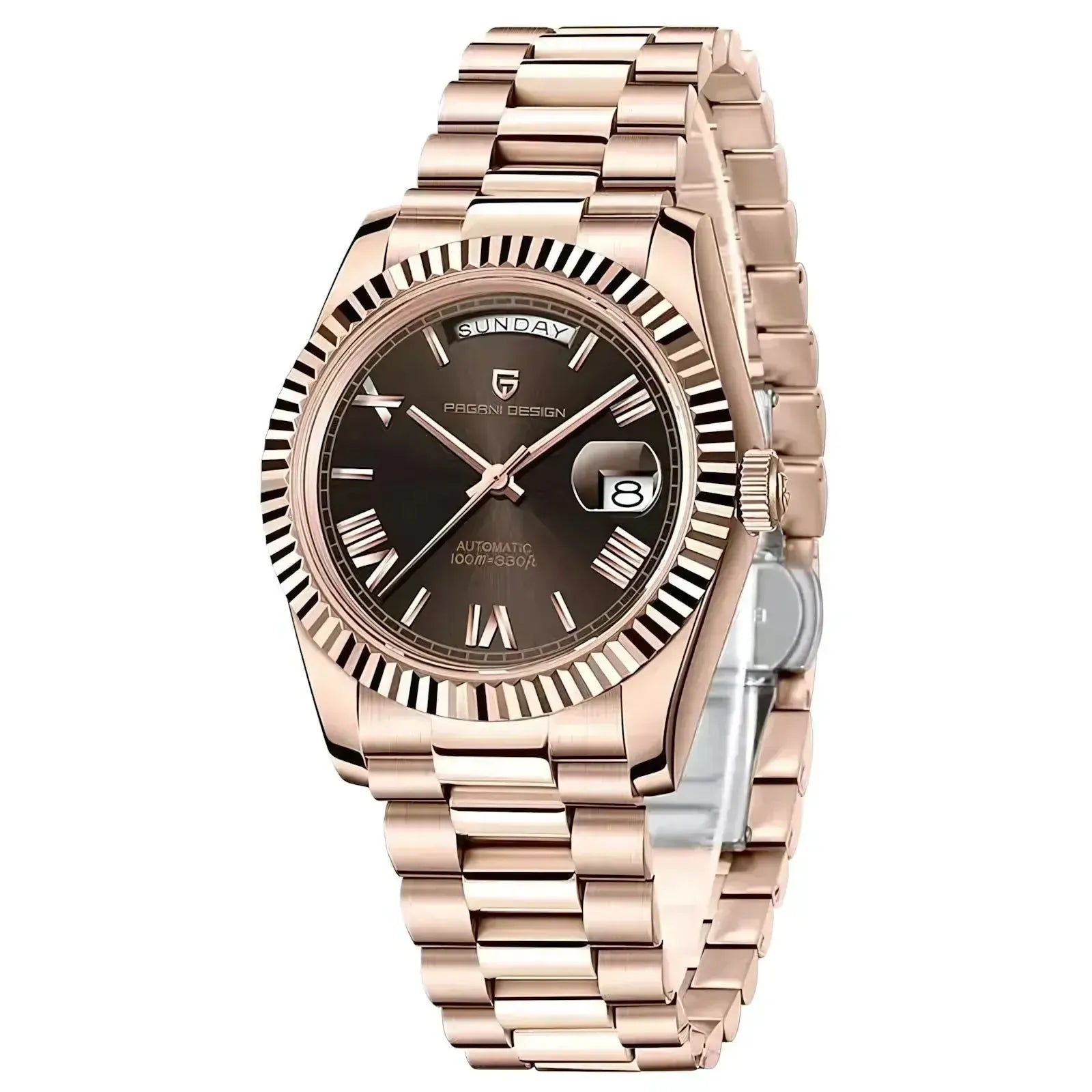 The Pagani Design PD-1752 Automatic Classic Calendar Watch offers timeless styling in a refined 36mm case, making it ideal for those who prefer a compact and elegant wrist presence. Its fluted bezel and Roman numeral dial create a distinguished look, while the full calendar display adds practical everyday functionality. Powered by the ST16 automatic mechanical movement, it supports both hand-winding and self-winding for smooth and reliable performance.