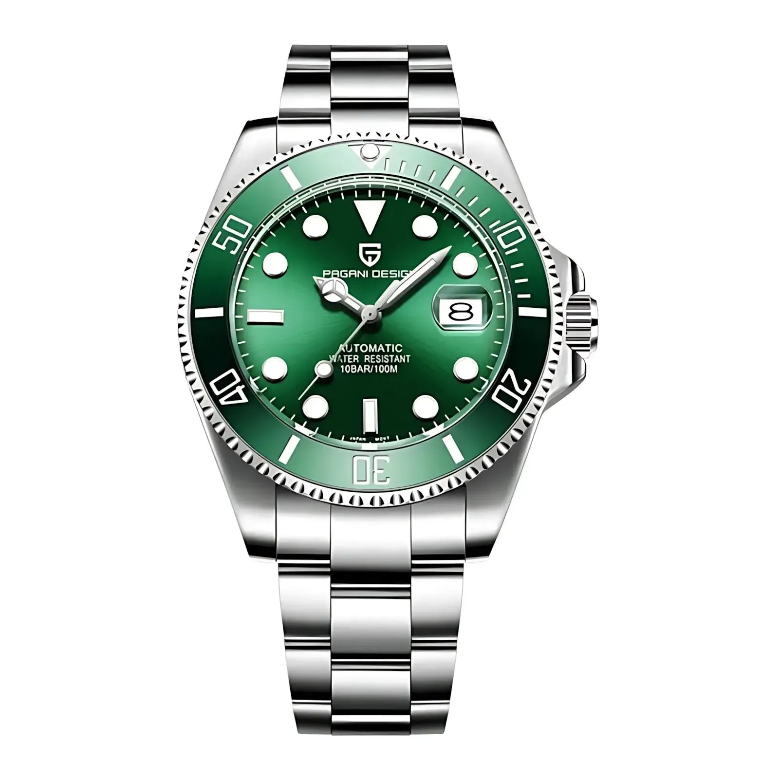 The Pagani Design 43mm Automatic Diver delivers bold proportions, durable construction, and dependable everyday performance. Built from 316L stainless steel with brushed and polished finishing, this larger 43mm diver offers a strong wrist presence while maintaining practical functionality for daily wear. Powered by the Japan Seiko NH35A automatic movement, it supports both hand-winding and self-winding for smooth and reliable operation.