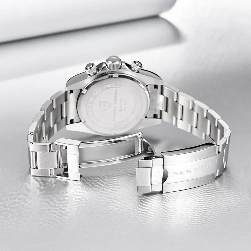 The Pagani Design PD-1644 Rainbow Bezel Chronograph is a bold and expressive 40mm timepiece crafted for collectors who appreciate vibrant color and modern precision. Its multi-colored crystal bezel adds a striking visual presence, while the brushed and polished 316L stainless-steel case delivers durability and everyday versatility. Powered by the Seiko VK63 meca-quartz movement, this chronograph provides smooth mechanical-style operation with quartz accuracy. A sapphire crystal ensures long-lasting clarity, and luminous hands and markers enhance readability in any light. With 100-meter water resistance and a secure folding clasp, the PD-1644 balances standout design with reliable functionality for both daily wear and special occasions.