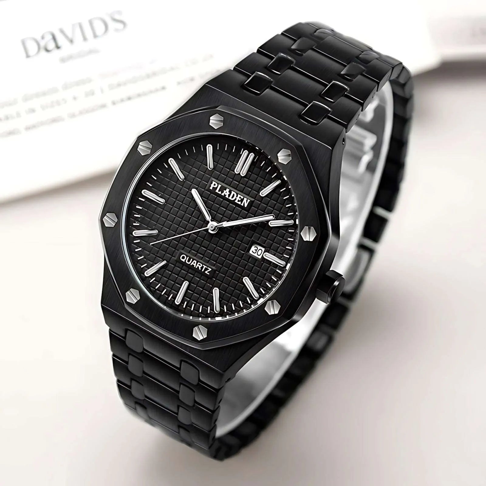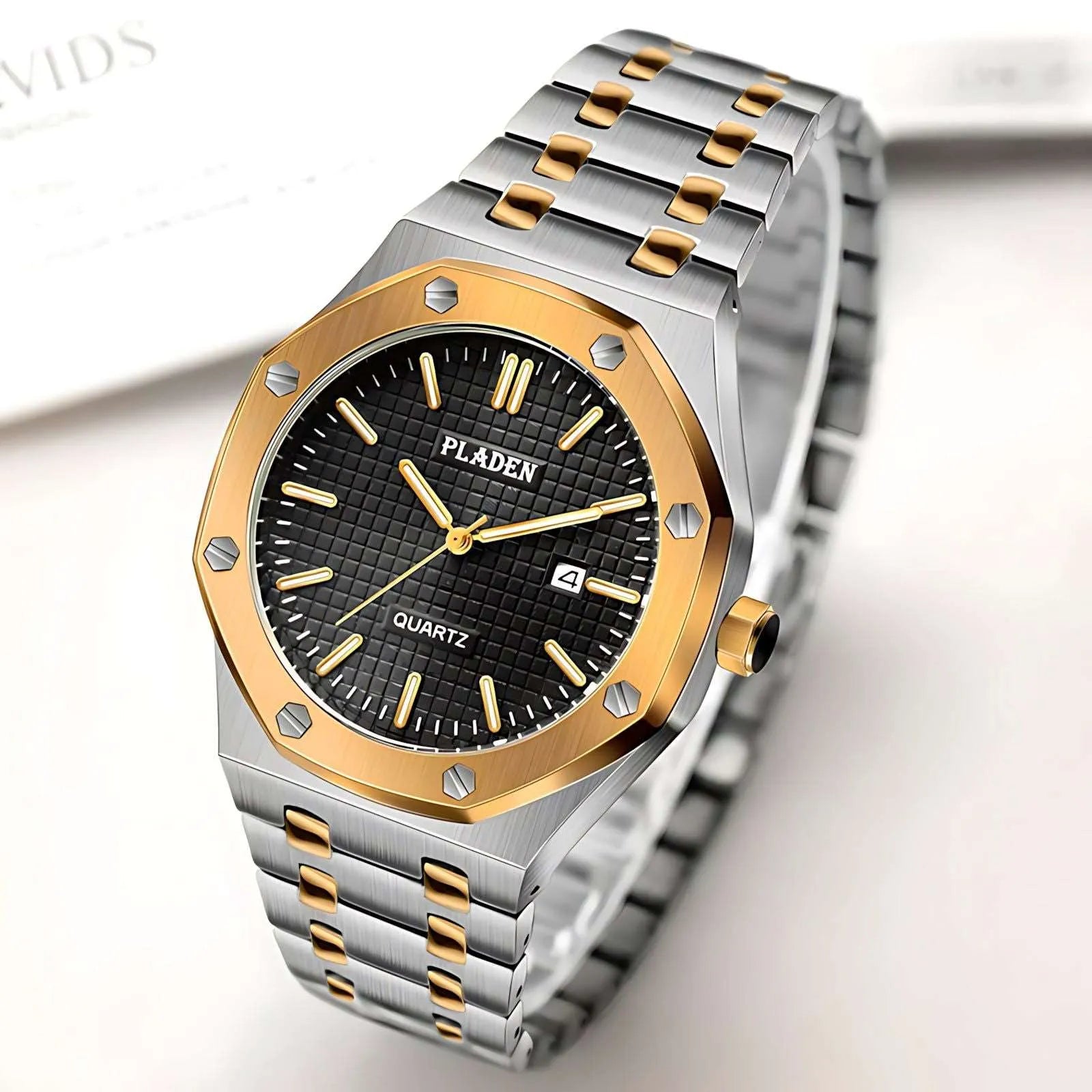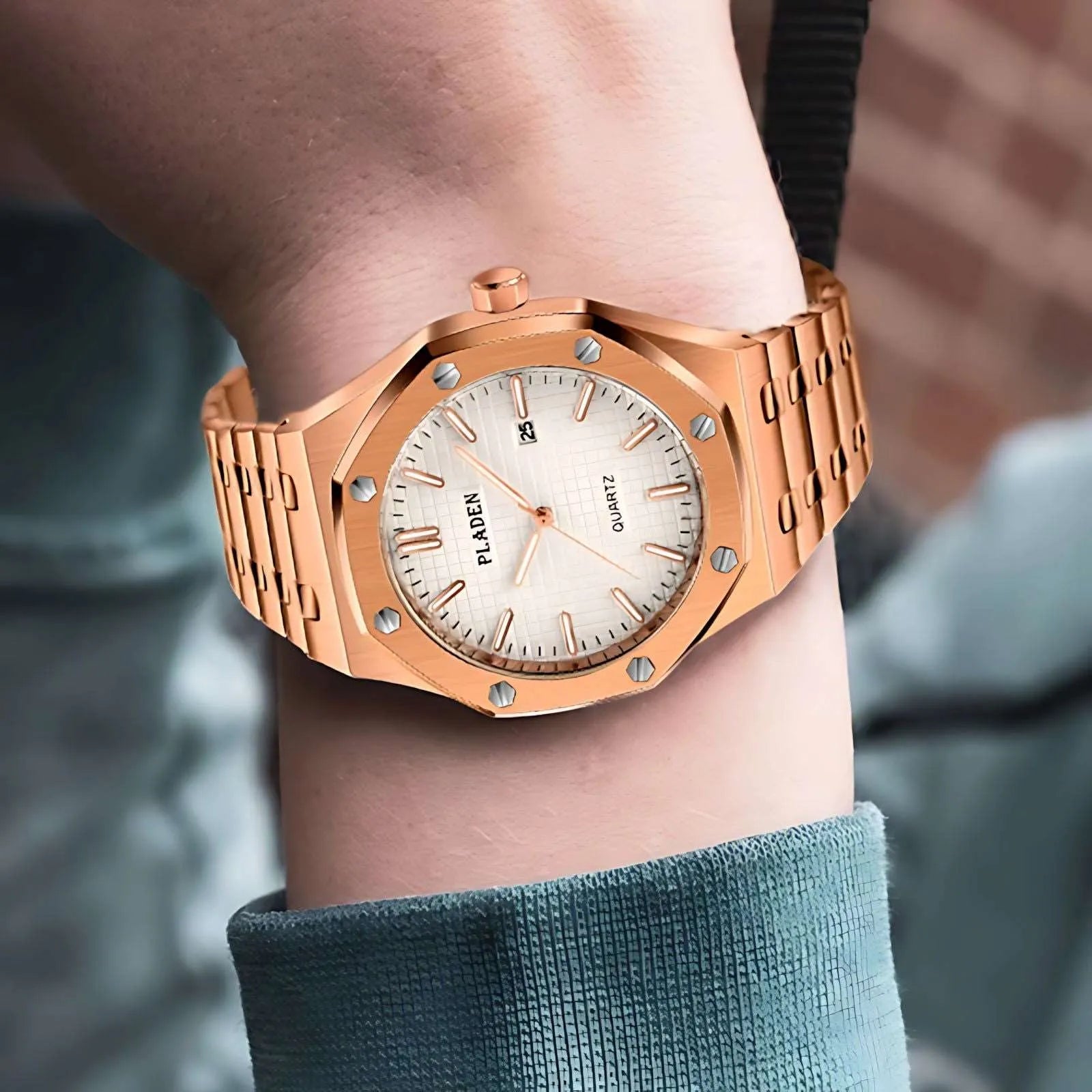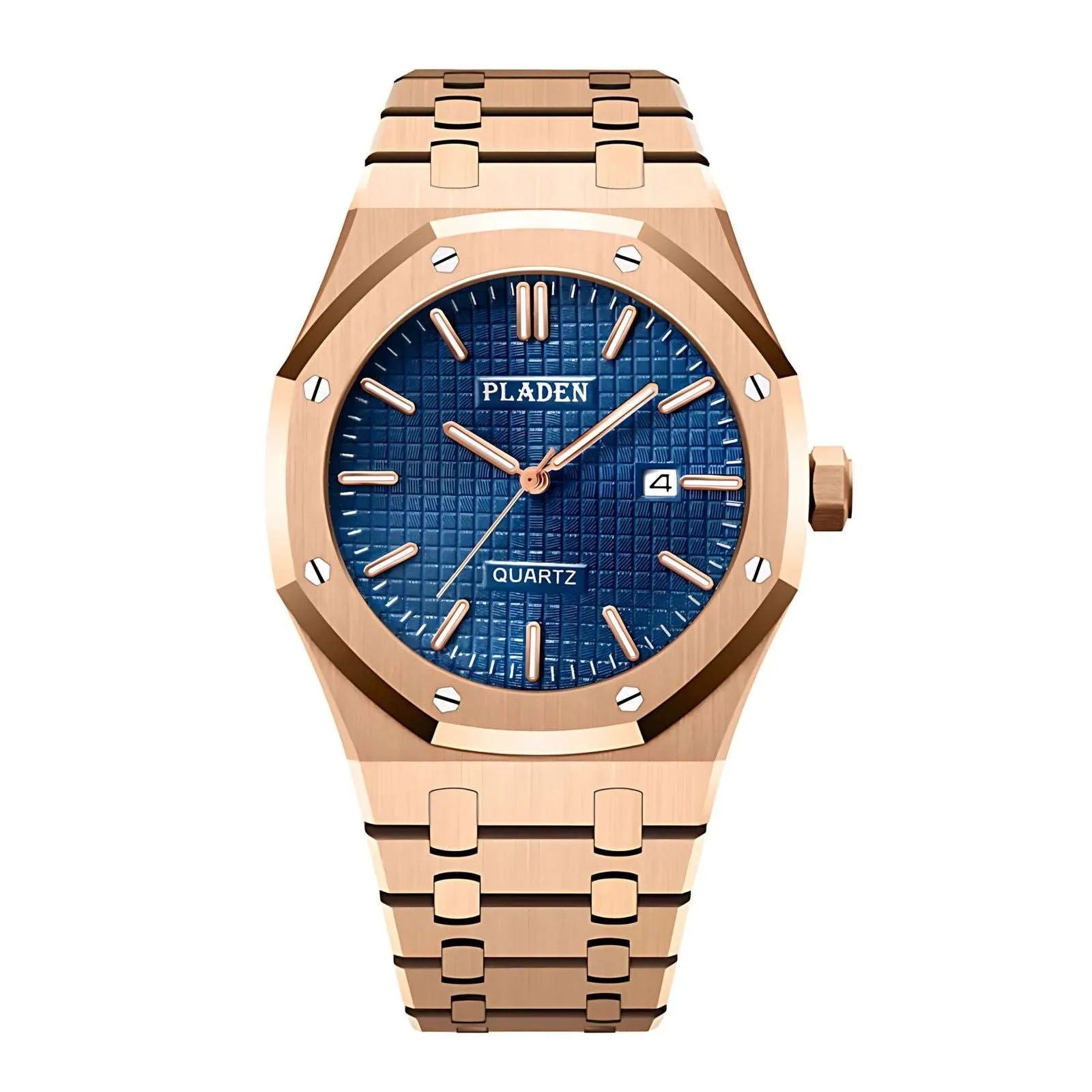 This 43mm quartz watch from Pladen features a distinctive rounded-octagonal case with exposed screw accents, delivering a structured and contemporary appearance suitable for both daily and formal wear. Crafted from 316L stainless steel, it provides durability and a refined brushed finish, while the Japanese quartz movement ensures accurate, low-maintenance timekeeping. The Hardlex crystal offers scratch-resistant clarity, and the complete calendar with date display at 3 o’clock enhances everyday practicality. Luminous hands support readability in low-light environments, and users can choose between a stainless-steel bracelet or a genuine leather strap for added versatility. With 3ATM water resistance and shock-resistant construction, this integrated-bracelet watch is built for comfort, simplicity, and dependable performance.