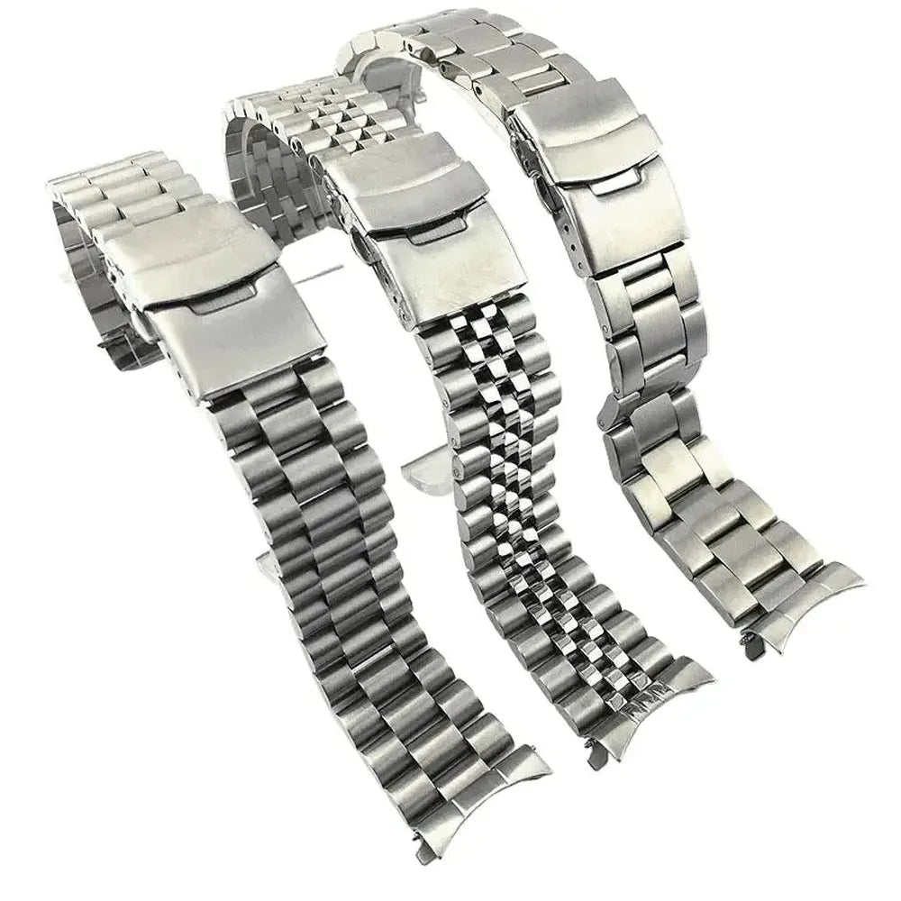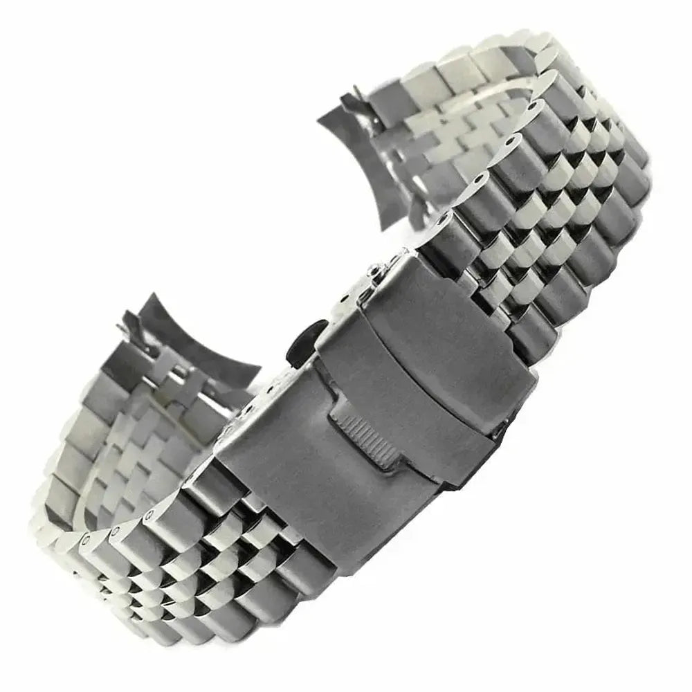 This solid stainless steel curved-end bracelet offers a secure, seamless, and rugged upgrade for diver and sport watches. Built with solid links, precision-machined curved end pieces, and a double-locking safety clasp, it provides dependable performance for daily use and professional wear. The polished and brushed finish delivers a balanced, versatile look suitable for both casual and formal settings.