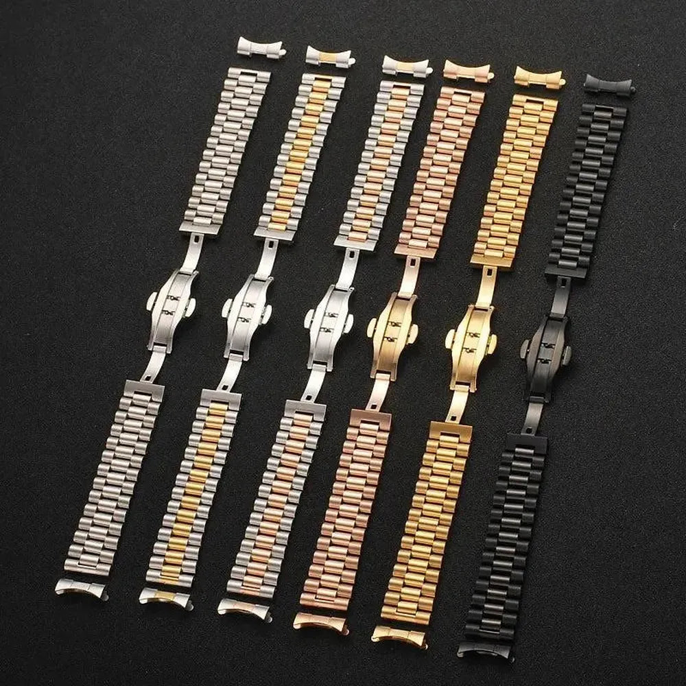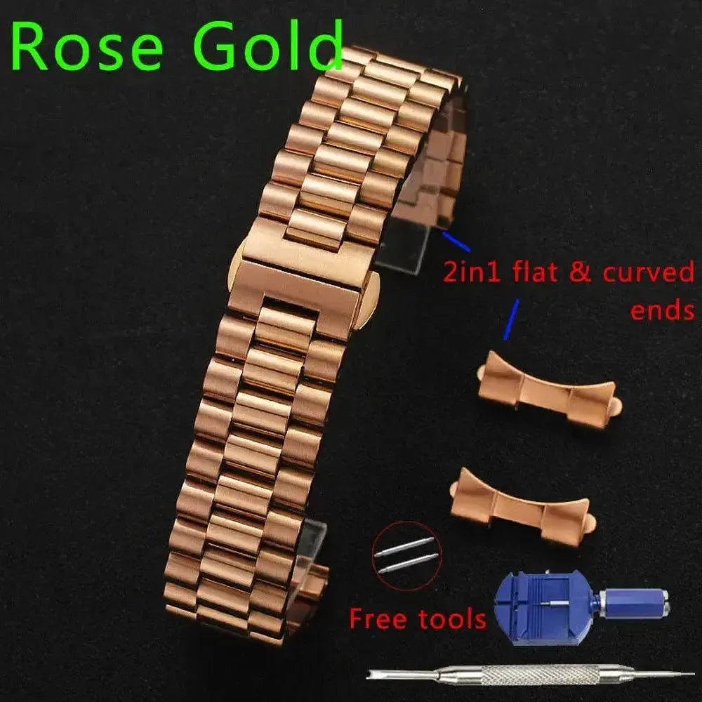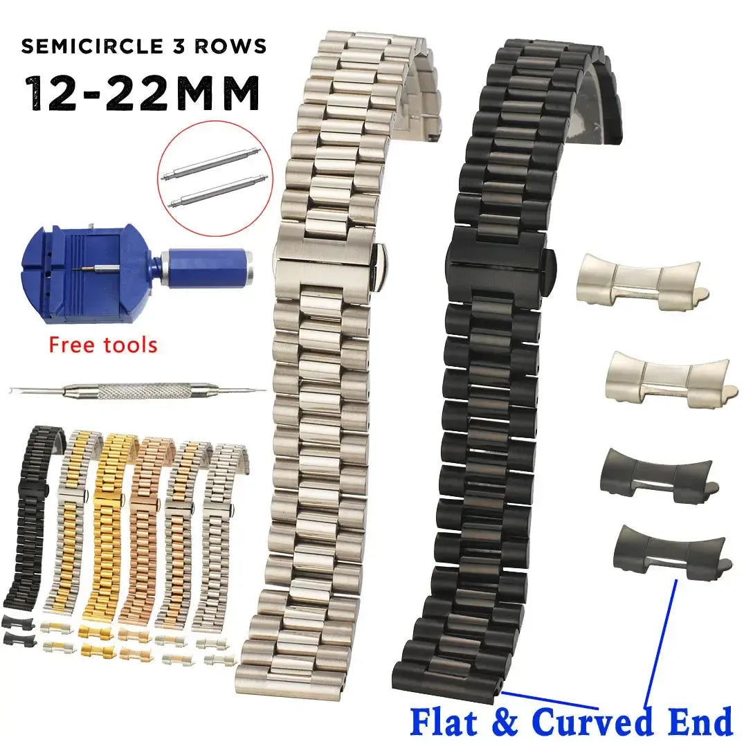Solid Stainless Steel President Style Replacement Watch Band – Flat & Curved End, 12mm–22mm